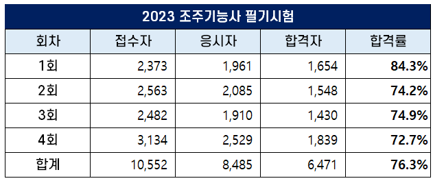 4회 조주기능사 필기시험 힙격률은 72.7%이고, 2023년 평균 합격률은 76.3%입니다.