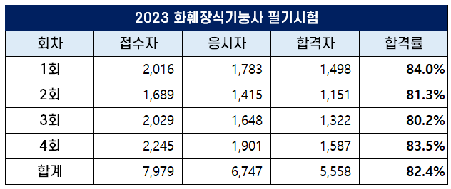 2023년 1회 화훼장식기능사 필기시험에는 2,016명이 응시원서를 접수했는데요. 이 중 1,783명이 시험에 응시해 1,498명이 합격했고, 합격률은 84.0%를 기록했습니다.
