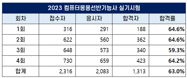 2023년 1회 컴퓨터응용선반기능사 필기시험에는 1,573명이 응시원서를 접수했는데요. 이 중 1,344명이 시험에 응시해 331명이 합격했고, 합격률은 24.6%를 기록했습니다.