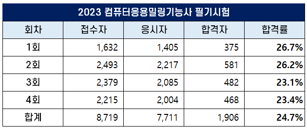 2023년 1회 컴퓨터응용밀링기능사 필기시험에는 1,632명이 응시원서를 접수했는데요. 이 중 1,4051명이 시험에 응시해 375명이 합격했고, 합격률은 26.7%를 기록했습니다.