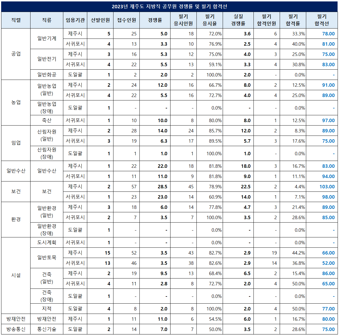 일반기계직의 필기 합격선은 5.0대 1의 경쟁률을 보인 제주시가 78.00점, 3.3대 1의 경쟁률을 보인 서귀포시가 81.00점이었습니다.