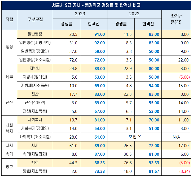 2023년 서울시 9급 행정 직군 합격선(커트라인) 과 경쟁률