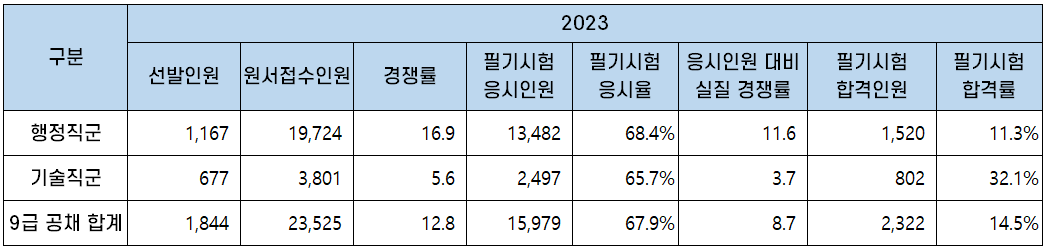 2023년과 2022년의 9급 공채 기술직군의 경쟁률 및 합격선을 비교하면 아래 표와 같습니다.