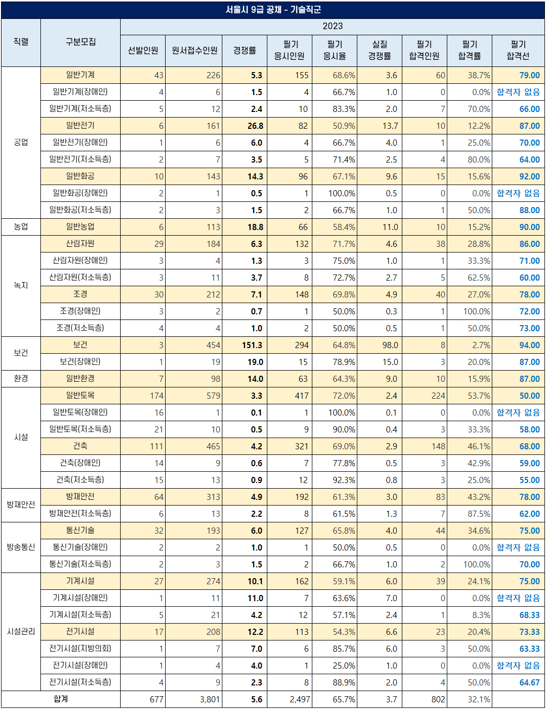 2023년 서울시 9급 공무원 기술 직군은 일반기계, 일반전기, 일반화공, 일반농업, 산림자원, 조경, 보건, 일반환경, 일반토목, 건축, 방재안전, 통신기술, 기계시설, 전기시설 등의 직렬에서 677명을 선발하는데 3,801명이 지원해 5.6대 1의 경쟁률을 기록했습니다.
