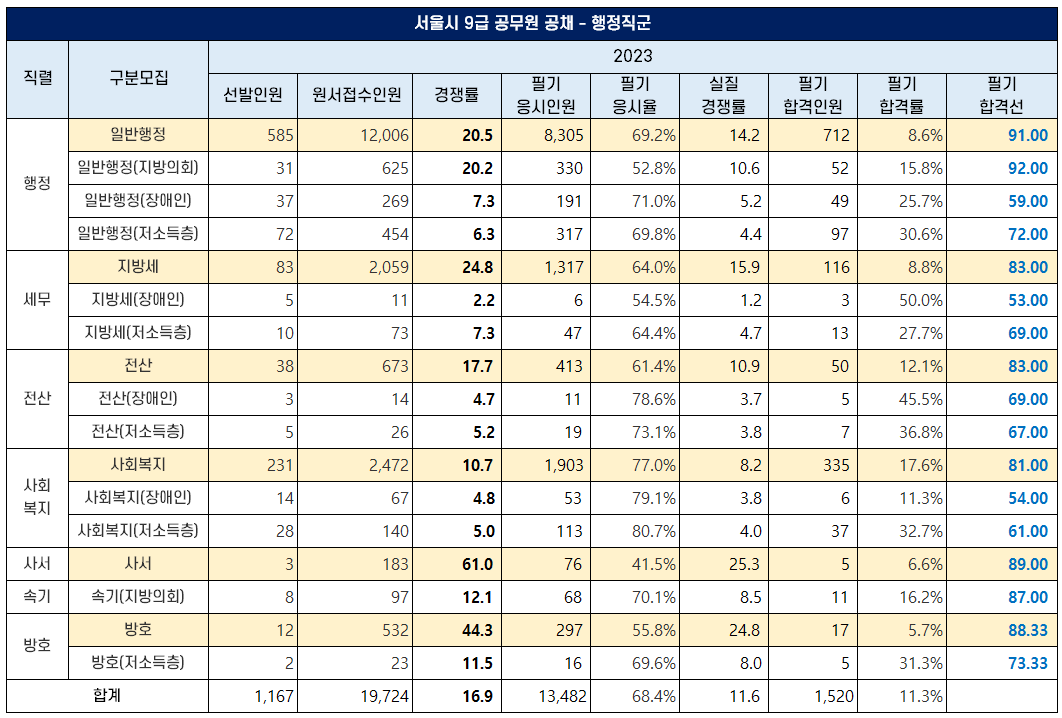 2023년 서울시 9급 공무원 행정 직군은 일반행정, 지방세, 전산, 사회복지, 사서, 속기, 방호 직렬에서 1,167명을 선발하는데 19,724명이 지원해 평균 16.9대 1의 경쟁률으 보였습니다.