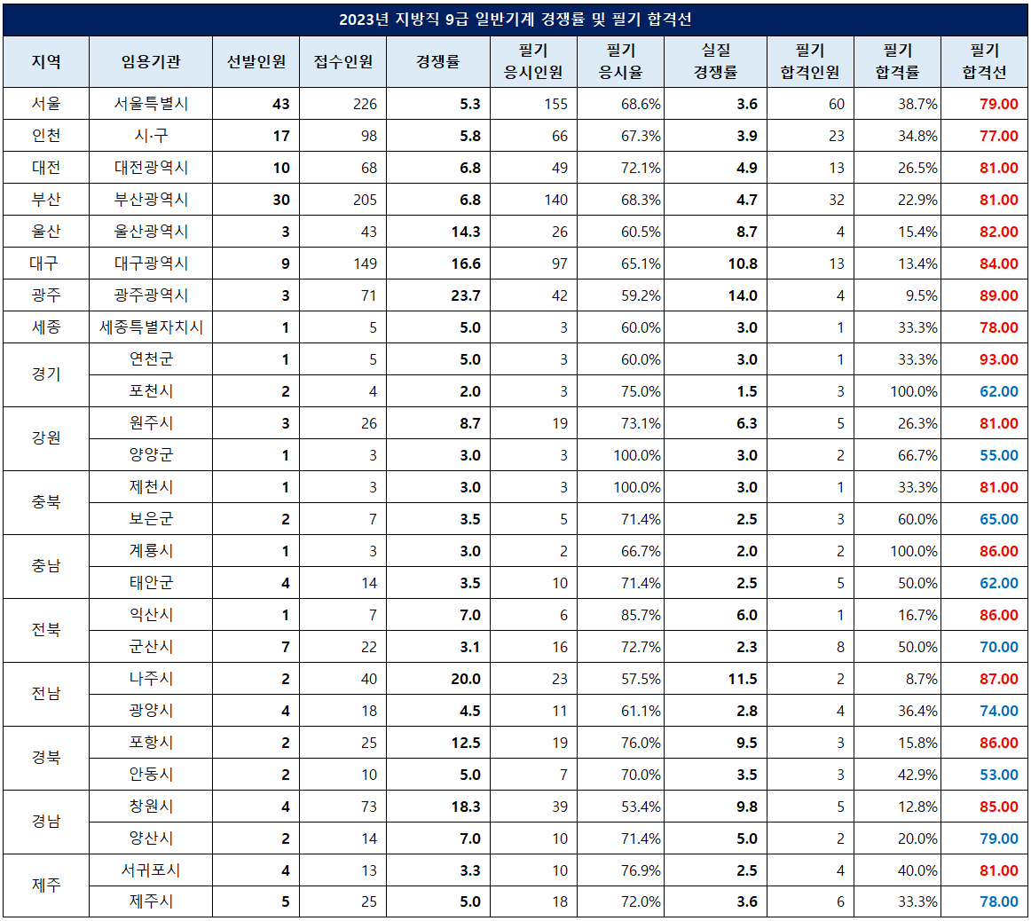 2023년 시도별 지방직 공무원 합격선 및 경쟁률