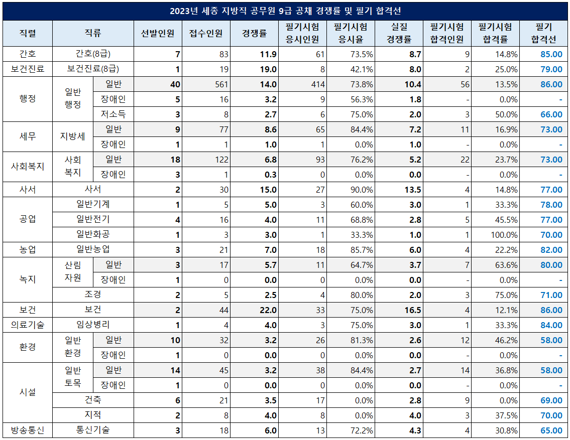 7월 25일에 필기시험 합격자를 발표한 2023년 세종시 9급 공채 경쟁률과 필기 합격선은 아래 표와 같습니다.