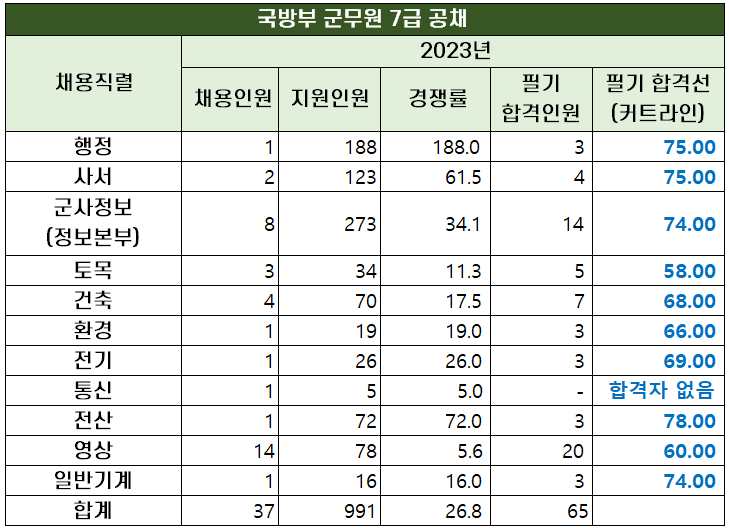 2023년 국방부 군무원 7급 공채는 37명을 채용하는데 991명이 원서접수를 해 26.8대 1의 경쟁률을 기록했습니다. 이 중 필기시험 합격인원은 65명입니다.