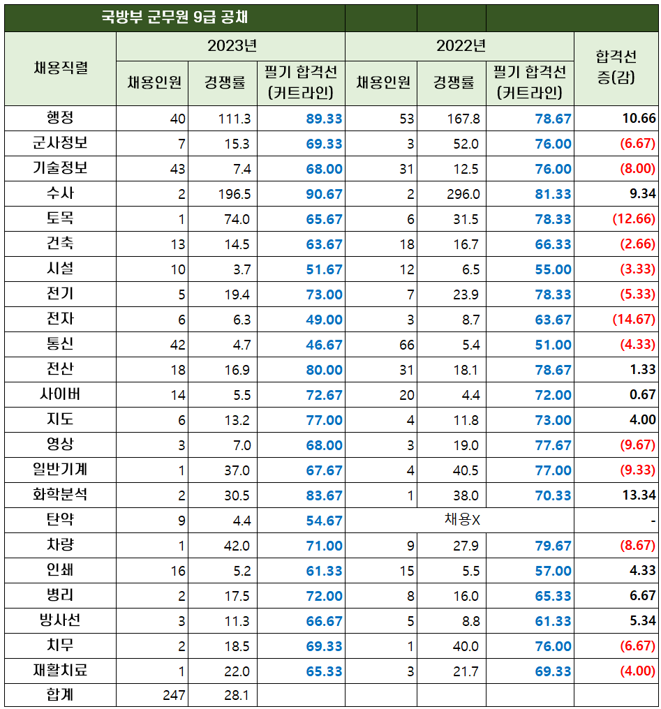 2023년과 2022년 국방부 군무원 9급 합격선을 비교하면 아래 표와 같은데요.