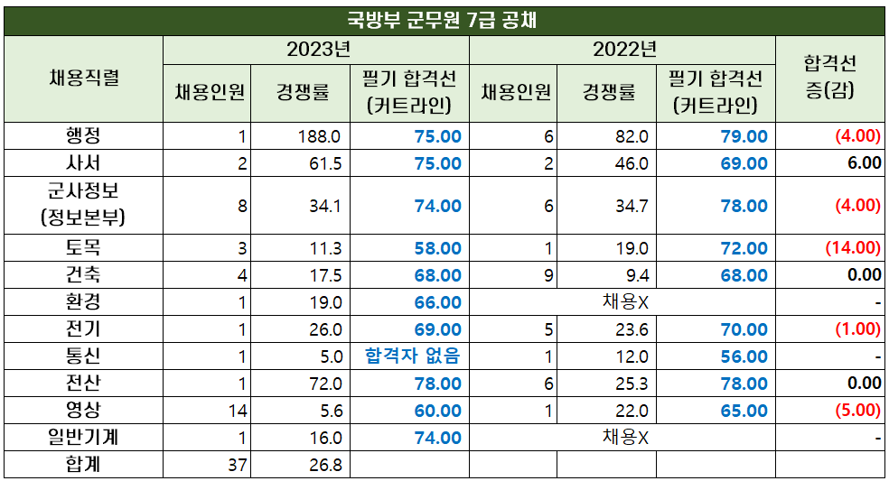 2023년 군무원 시험 일정, 채용 인원, 국방부 군무원 경쟁률, 2022년 필기 커트라인 등은 다음 포스팅을 참고하세요