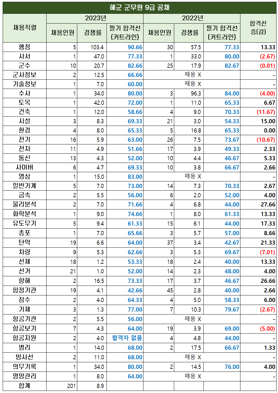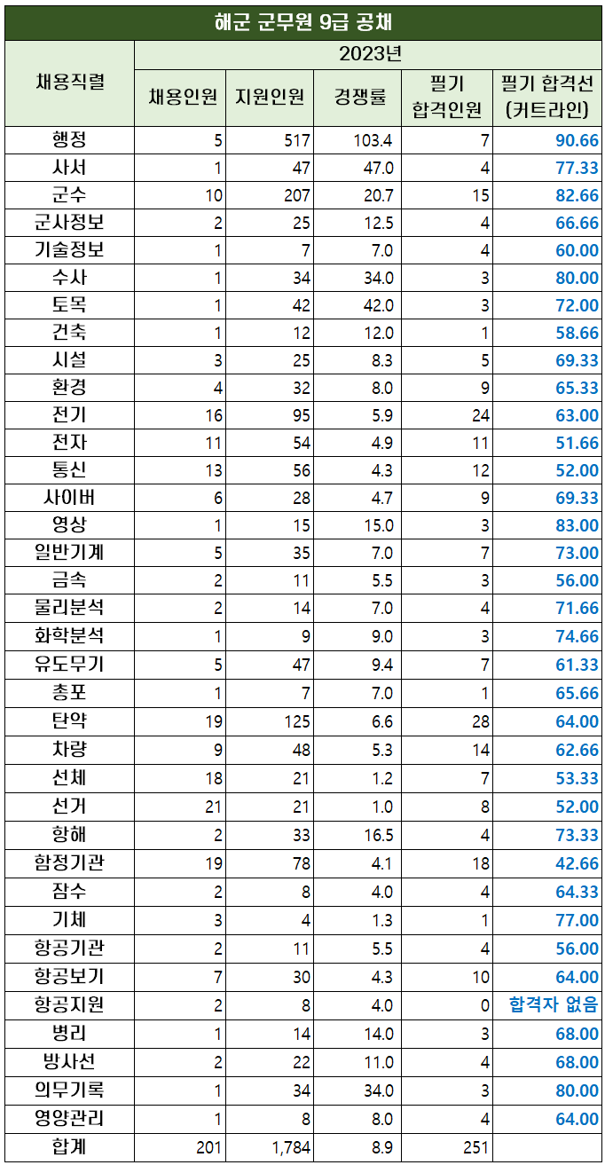 2023년 해군 군무원 9급 공채는 36개 직렬에서 201명을 채용하는데 1,784명이 지원해 8.9대 1의 경쟁률을 보였습니다. 이 중 251명이 필기시험에 합격했는데요. 채용 직렬별 필기 커트라인은 아래 표와 같습니다.