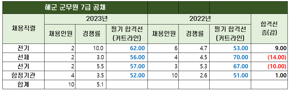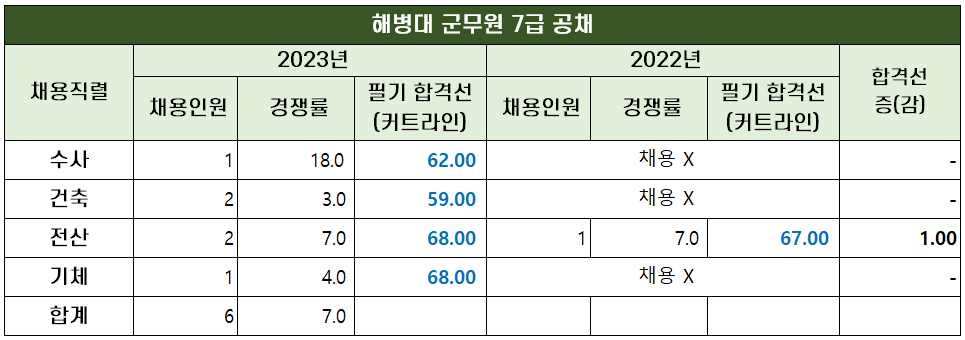 2023년과 2022년의 해군 군무원 7급 합격선을 비교하면 아래 표와 같은데요.