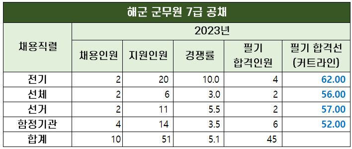 2023년 해군 군무원 7급 공채는 4개 직렬에서 10명을 채용하는데 51명이 원서접수를 해 5.1대 1의 경쟁률을 기록했습니다. 이 중 45명이 필기시험에 합격했는데요. 채용 직렬별 필기 커트라인은 아래 표와 같습니다.