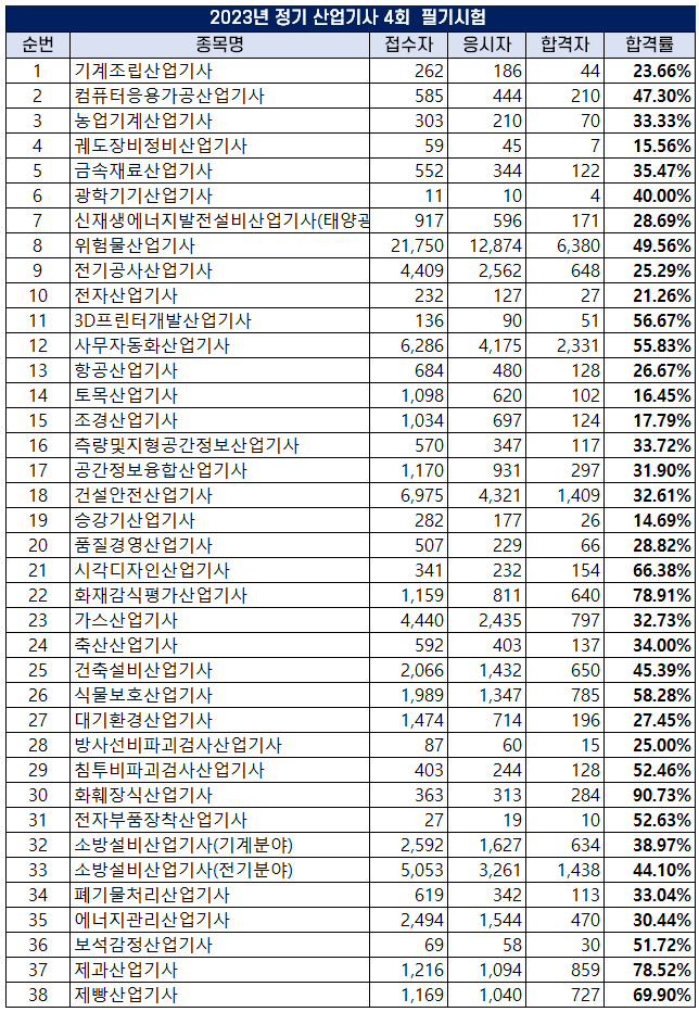 2023년 4회 정기 필기시험에서는 위험물산업기사를 비롯해 총 38개 산업기사 자격증 종목의 시험이 시행되었고, 채점 결과 및 종목별 합격률은 아래 표와 같습니다.