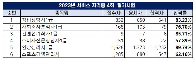 2023년 4회 정기 필기시험에서는 작업상담사 2급을 비롯해 총 6개 서비스 자격증 종목의 시험이 시행되었고, 채점 결과 및 종목별 합격률은 아래 표와 같습니다.