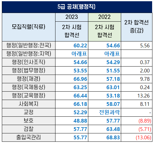 2023년과 2022년의 2차 필기시험 합격선을 비교해 아래 표로 정리했습니다.