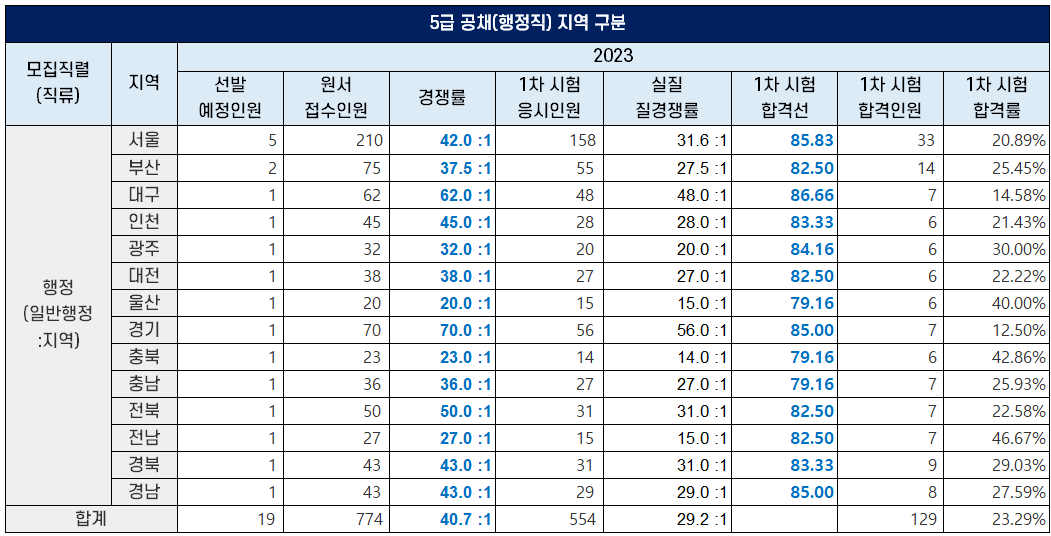 | 행정(일반행정:지역) | 19 | 40.7 :1 | 29.2 :1 | 아래표 | 23.29% |