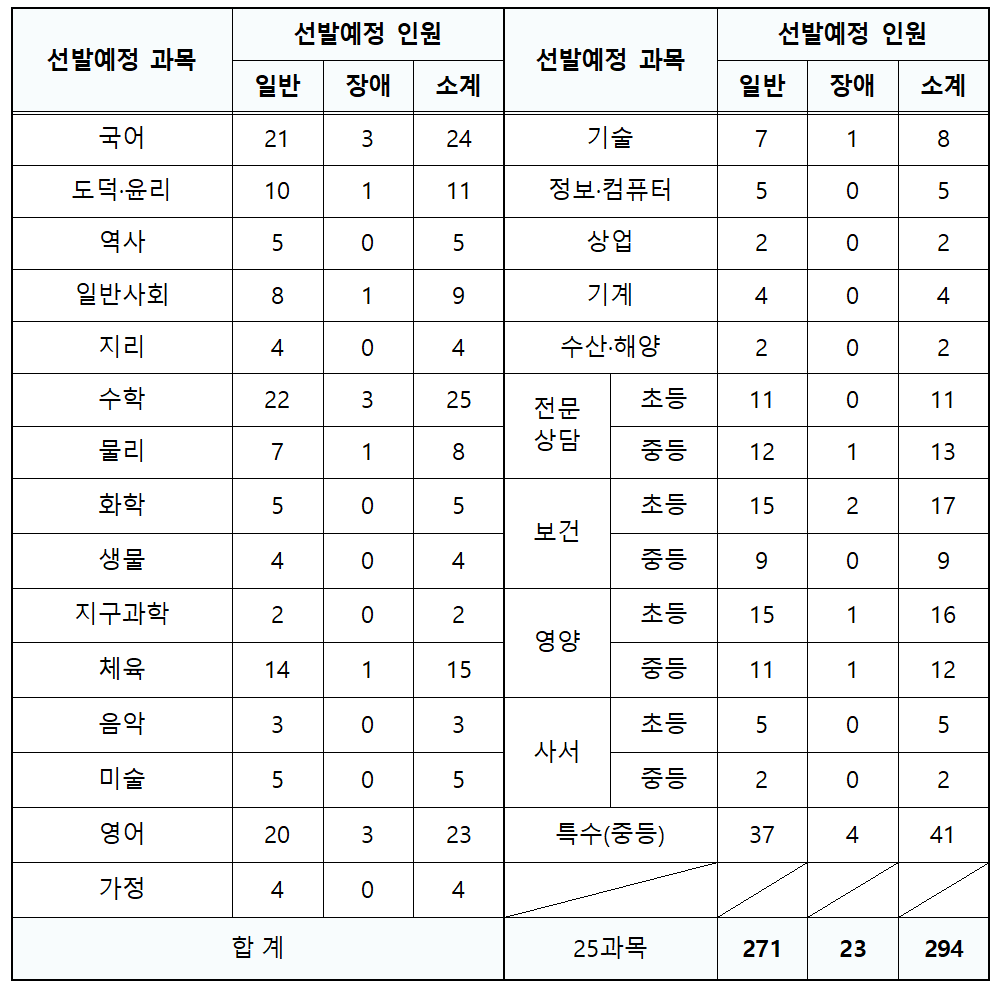 교과과목 중에서는 체육과 영어의 티오가 24명으로 가장 많고, 도덕윤리와 수학이 19명입니다.