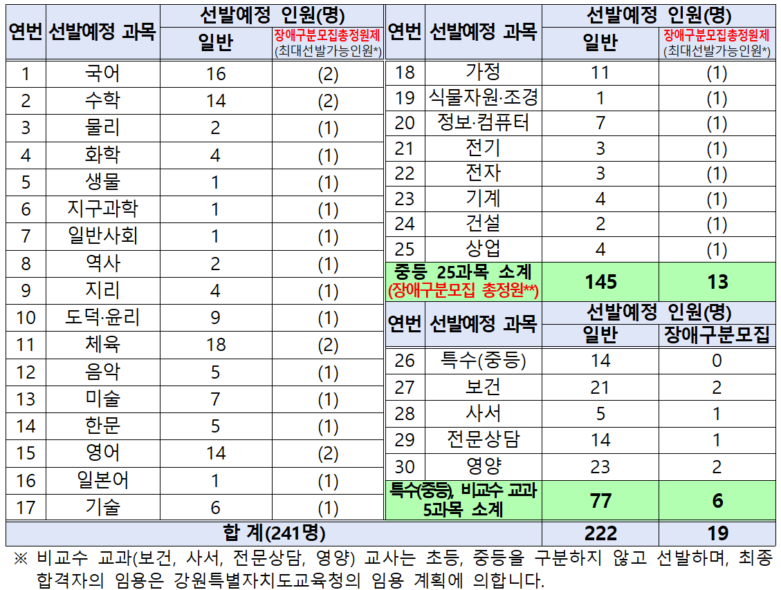 2024년 강원도 교육청은 30개 과목에서 총 247명을 선발하는데요. 지난해 252명보다 선발에정인원이 5명 감소했습니다.
