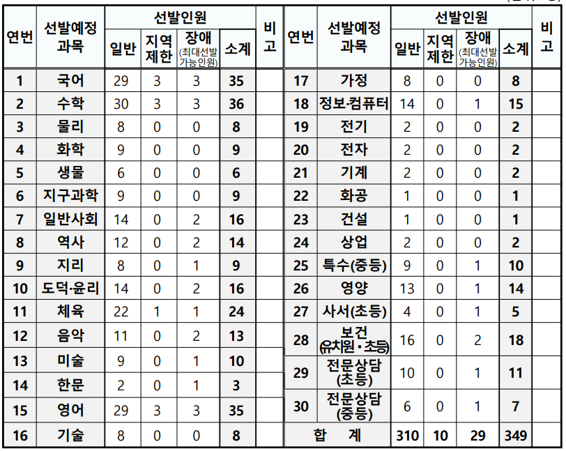 2024년 충청남도 교육청은 30개 과목에서 총 349명을 선발하는데요. 지난해 430명보다 선발에정인원이 81명 감소했습니다.