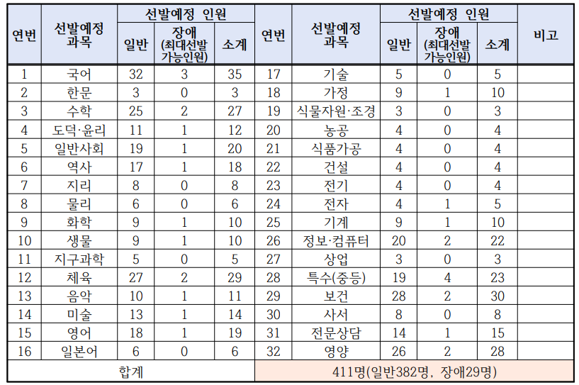 교과과목 중에서는 국어의 티오가 35명으로 가장 많고, 체육이 29명, 수학이 27명 입니다.