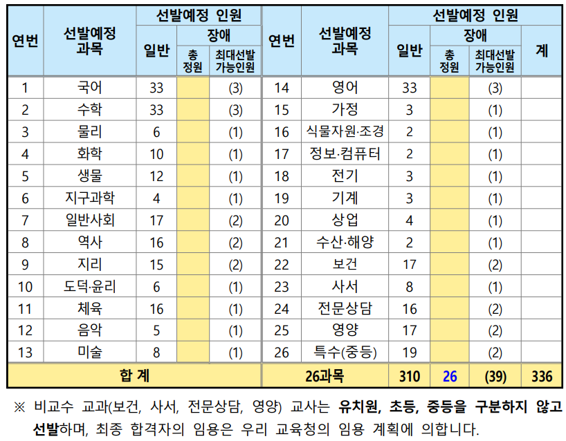 2024년 전라남도 교육청은 26개 과목에서 총 3368명을 선발하는데요. 지난해 348명보다 선발에정인원이 12명 감소했습니다.