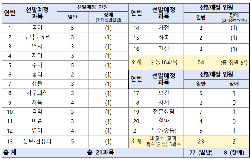 2024년 대구시 교육청은 21개 과목에서 총 68명을 선발하는데요. 지난해 77명보다 선발에정인원이 9명 감소했습니다.