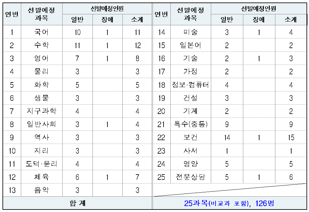 2024년 제주시 교육청은 25개 과목에서 총 126명을 선발하는데요. 지난해 178명보다 선발에정인원이 52명 감소했습니다.