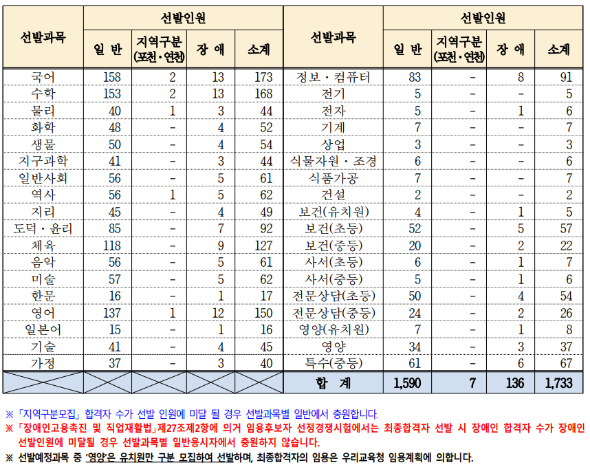 교과과목 중에서는 국어의 티오가 1736명으로 가장 많고, 수학이 168명, 영어가 150명입니다.