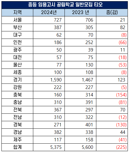 2024년에는 일반모집으로 선발하는 중등 교사가 5,375명으로 지난해 티오 5,600명보다 선발예정인원이 225 감소했습니다.
