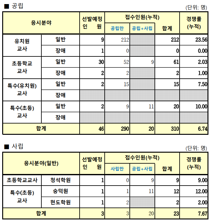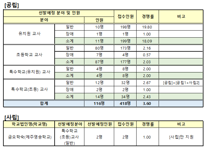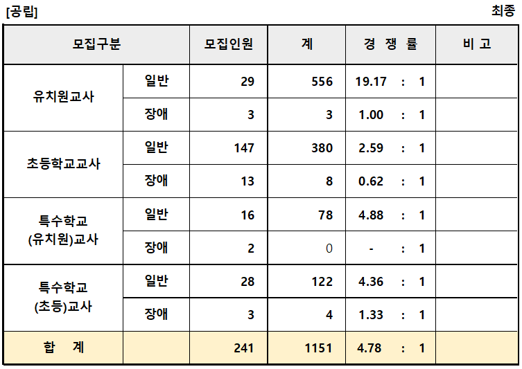 이번 포스팅에서는 전국 17개 시·도교육청에서 선발하는 공립 유치원, 초등학교, 특수학교(유치원·초등) 임용 고시 경쟁률을 비교 정리하고, 각 시도 교육청의 원서접수 현황 파일을 첨부했습니다. 사립학교 원서접수현황 및 경쟁률 및 지역 구분 모집 경쟁률은 아래 시도교육청별 경쟁률을 보시기 바랍니다.