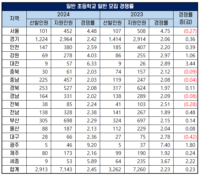 2024학년도 초등 임용 고시 일반 모집 선발인원, 지원인원, 및 경쟁률 현황은 아래 표와 같은데요. 총 2,913명을 선발하는데 7,143명이 지원해 평균 경쟁률은 2.45대 1입니다.