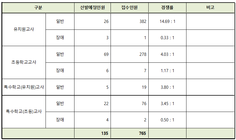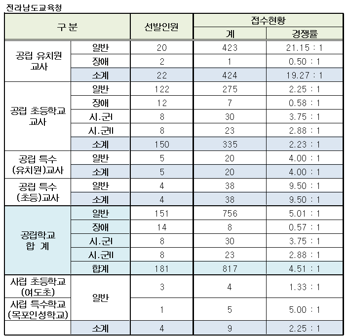 참고로 경기도, 충청남도, 전라남도의 경우 일반모집인원에 지역구분 모집 인원도 포함되어있으니 상세한 구분 내역은 아래 각 시도교육청별 경쟁률을 보시기 바랍니다.