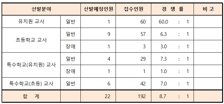| 지역 | 선발인원 | 지원인원 | 경쟁률 |