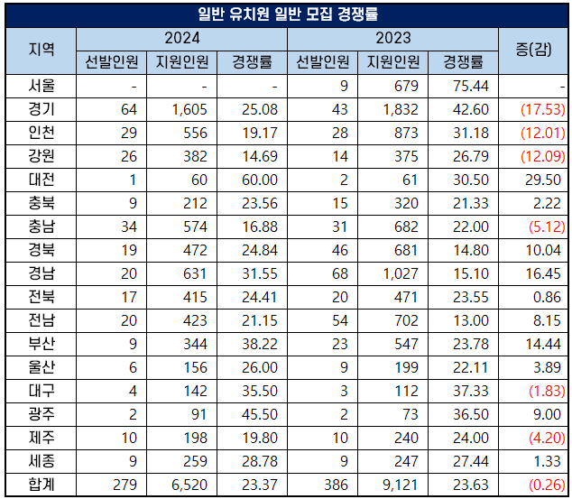 2024학년도 유치원 임용 고시 일반 모집 선발인원, 지원인원, 및 경쟁률 현황은 아래 표와 같은데요. 17개 시도 교육청에서 총 279명의 유치원 교사를 일반 모집으로 선발하는 데 6,520명이 원서접수를 해 평균 경쟁률은 23.37대 1입니다.