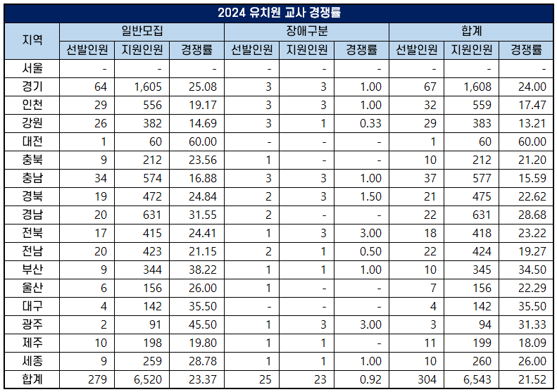 2024학년도 유치원 교사 선발인원, 지원인원, 및 경쟁률 현황은 아래 표와 같은데요. 2024학년도 유치원 교사는 일반모집과 장애구분 모집을 합해 서울을 제외한 16개 시도 교육청에서 총 304명을 선발하는데 6,543명이 원서접수를 해 평균 21.52대 1의 경쟁률을 기록했습니다.