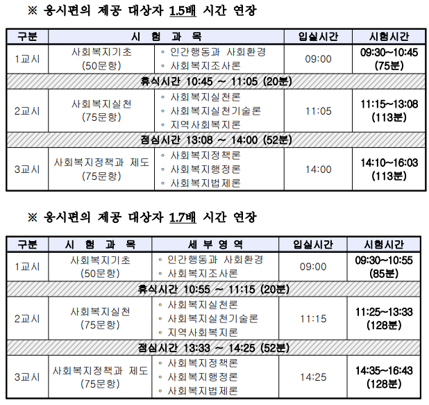일반수험자는 점심시간이 없지만 응시편의 제공대상자는 50~52분 정도의 점심시간이 제공되는데요. 시험 시간표는 다음과 같습니다.