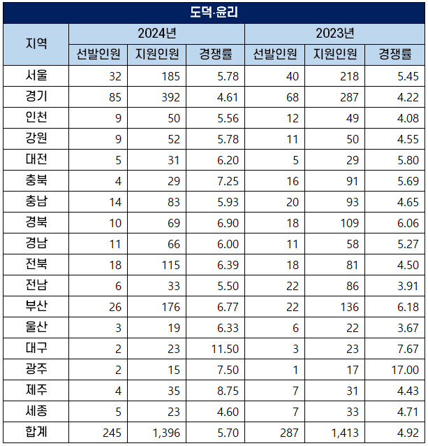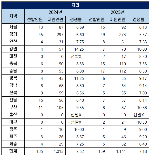 이번 포스팅에서는 2024학년도 17개 시도 교육청에서 시행하는 중등학교교사 임용후보자 선정경쟁시험 중 주요 교과과목(국어, 수학, 물리, 화학, 생물, 지구과학, 일반사회, 역사, 지리, 도덕·윤리, 체육, 음악, 미술, 영어, 기술, 가정, 정보·컴퓨터)의 '일반모집' 티오와 경쟁률을 비교 정리했습니다.