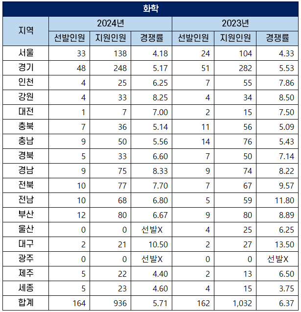2024년 울산과 광주를 제외한 15개 시도 교육청에서 선발하는 화학 중등학교 교사 티오는 164명으로, 지난해 티오 162명보다 2명이 늘었습니다.