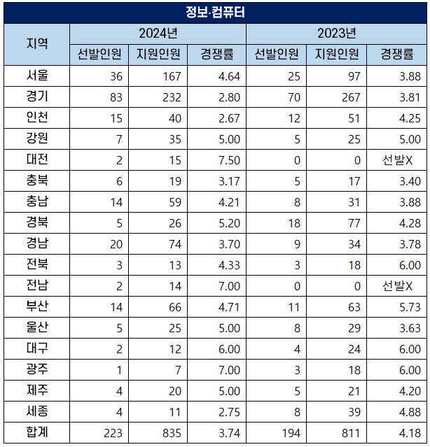 2024년 전국 17개 시도 교육청에서 선발하는 정보·컴퓨터 중등학교 교사 티오는 223명으로, 지난해 티오 194명보다 29명이 늘었습니다.