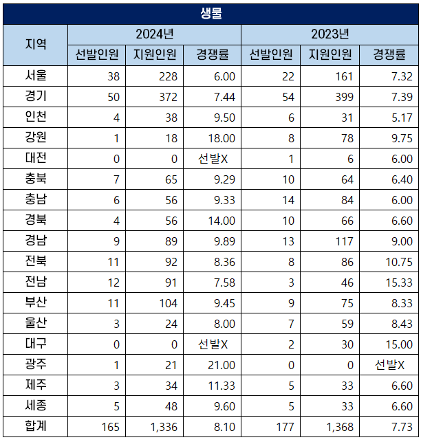 2024년 대전과 대구를 제외한 15개 시도 교육청에서 선발하는 생물 중등학교 교사 티오는 165명으로, 지난해 티오 177명보다 12명이 감소했습니다.