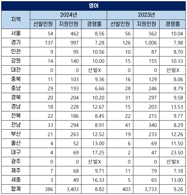 영어 중등교사 3863명을 선발하는데 3,403명이 원서접수를 해 평균 경쟁률은 8.82대 1을 기록했는데요. 지난해 경쟁률 9.26대 1보다 경쟁률이 하락했습니다.