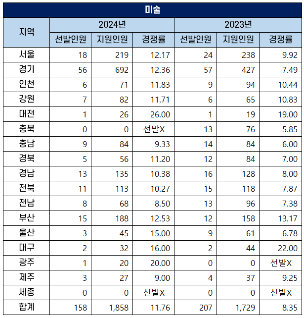 56명으로 가장 많은 인원의 미술 중등교사를 선발하는 경기도에는 692명이 지원해 12.36대 1의 경쟁률을 보였습니다.