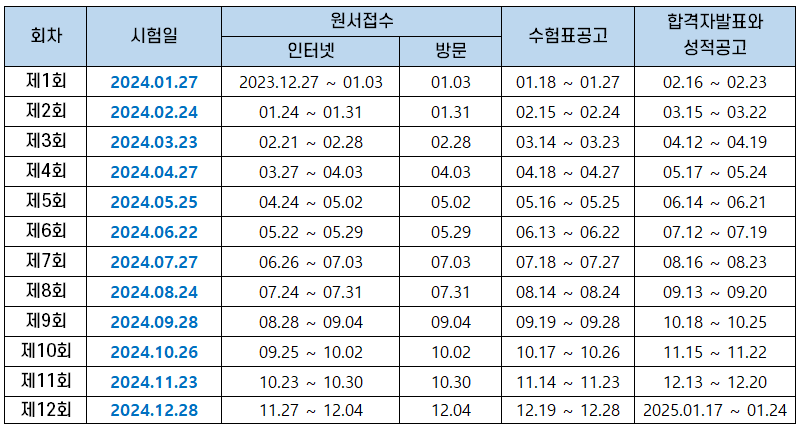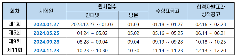 | 회차 | 시험일 | 원서접수 | 수험표공고 | 합격자발표와 성적공고 |