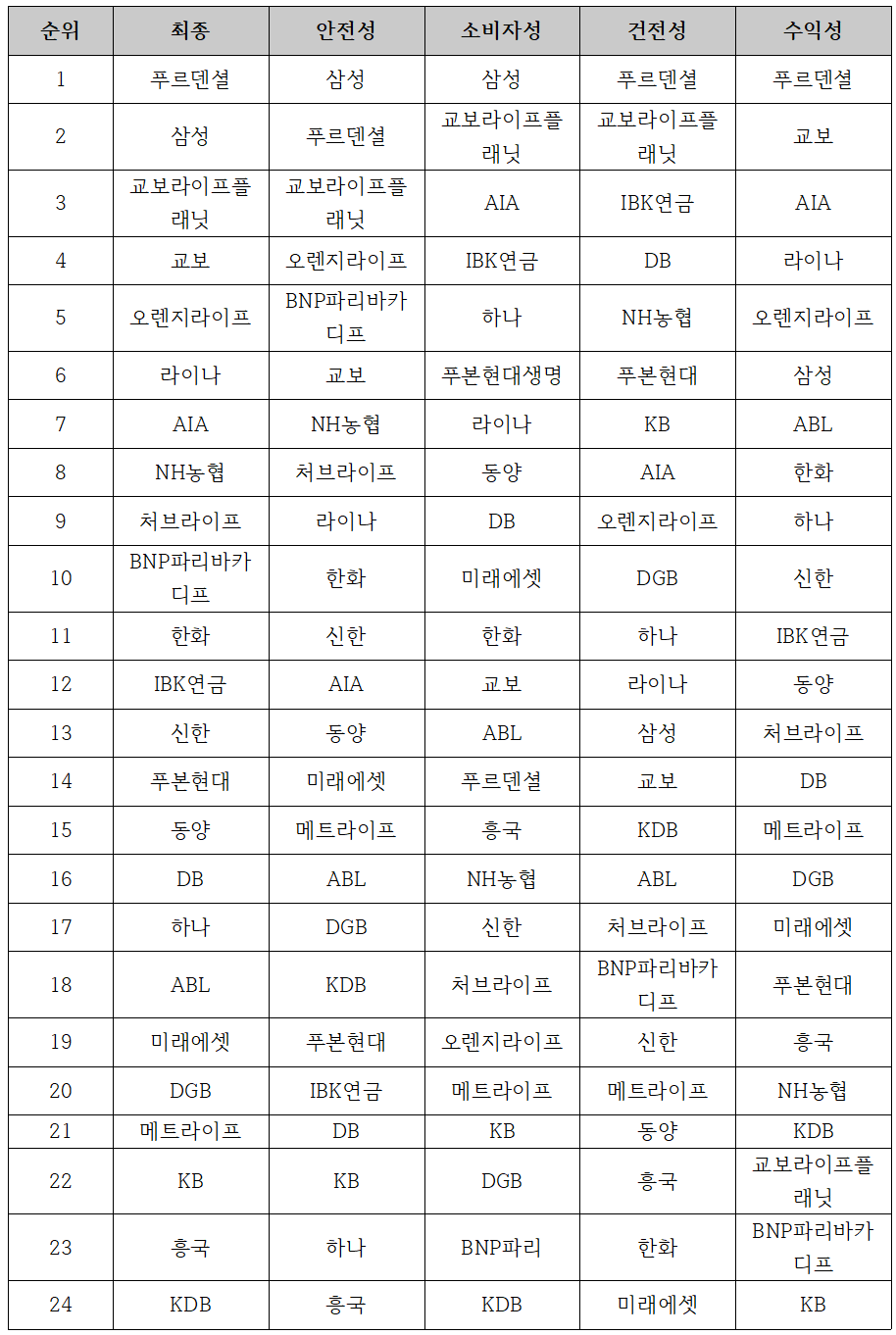 | 순위 | 최종 | 안전성 | 소비자성 | 건전성 | 수익성 |