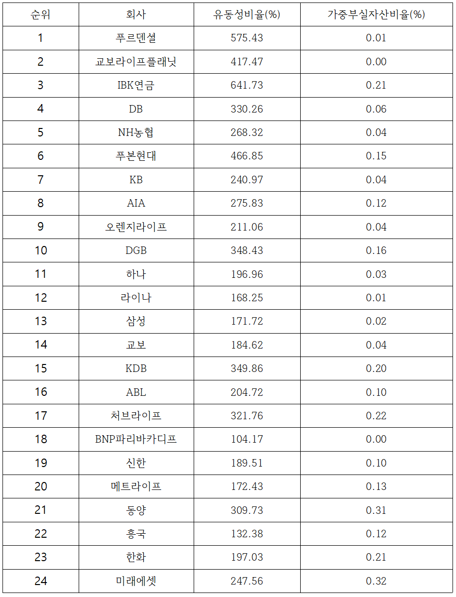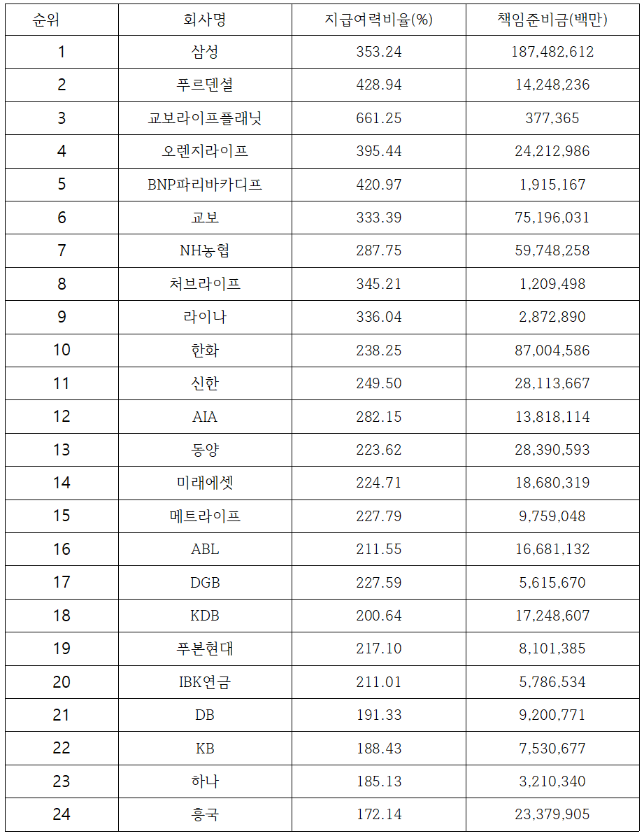 | 순위 | 회사명 | 지급여력비율 (%) |