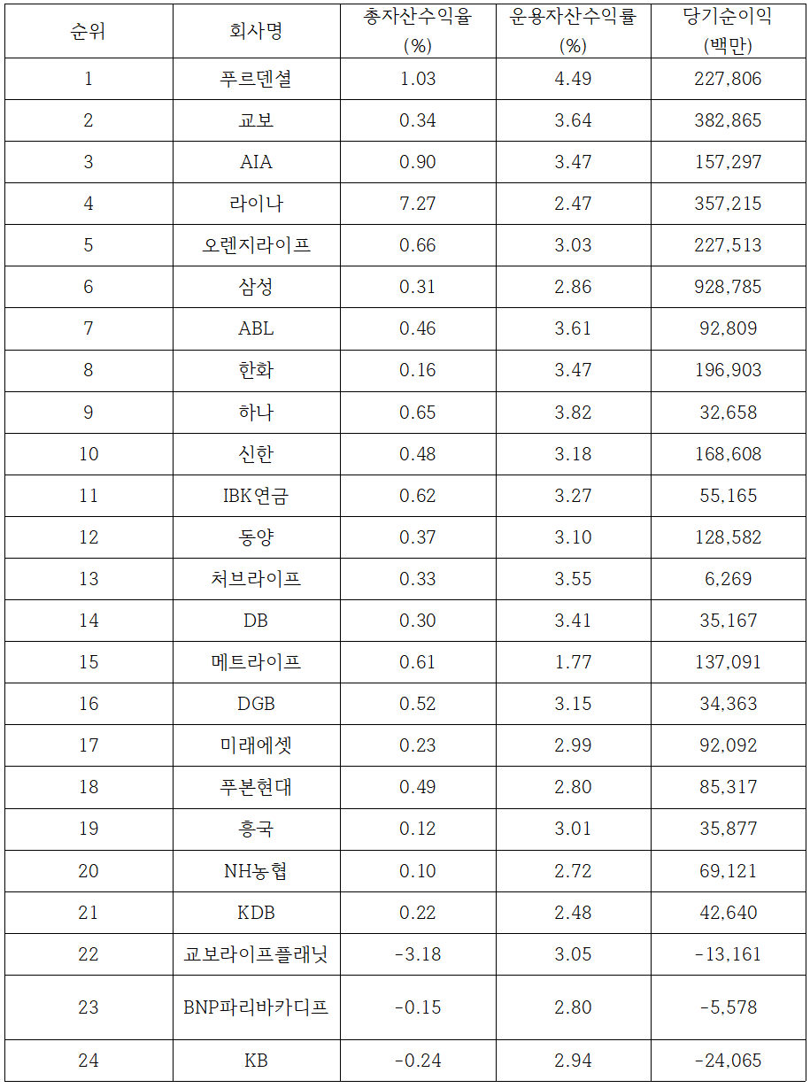 | 6 | 푸본현대생명 | 13.96 | 0.16 | 1.46 | 0.3 |
