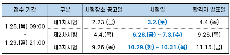 | 제2차시험 | 4.4.(목) | 6.28.(금) ∼ 7.3.(수) | 9.26.(목) | |