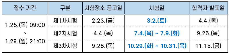 | 제2차시험 | 4.4.(목) | 7.4.(목) ∼ 7.9.(화) | 9.26.(목) | |