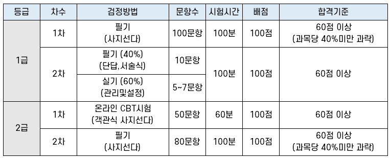 리눅스마스터 2급 1차 시험만 온라인 CBT시험으로 시행되고, 리눅스 마스터 2급 2차 시험과 리눅스마스터 1급 1차 및 2차시험은 시험장에 모여 시험을 보는데요. 시험 출제 방식과 문항수 및 합격기준은 아래 표와 같습니다.